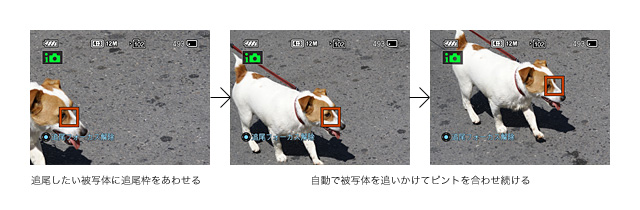 液晶画面上で撮りたい被写体にタッチするだけで、被写体に追尾枠がセットされ、フォーカシングがスタート。被写体が動いても追尾枠が追いかけ、ピントを合わせ続けるのでズームや構図づくりに集中でき、シャッターチャンスを逃しません。よく動き回る子どもやペットを撮影する時にも便利です。