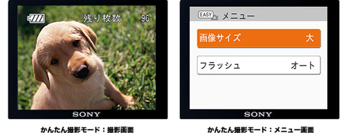 画像サイズ、フラッシュ、セルフタイマーだけを設定できるシンプルな操作モード。設定項目を制限することで、誤動作を防止できます。文字も大きく見やすいので、操作も簡単。モードダイヤルを回して「かんたん撮影モード(EASY)」に合わせるだけで、すぐに切り換えられます。