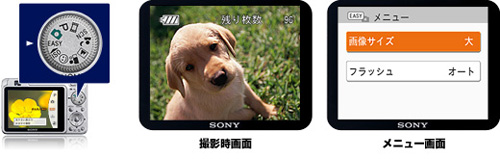 画像サイズ、フラッシュ、セルフタイマーだけを設定できるシンプルな操作モード。文字も大きく見やすいので、簡単に操作できます。モードダイヤルを回して「かんたん撮影モード(EASY)」に合わせるだけで、すぐに切り換えられます。
