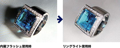 マクロ撮影時に役立つ、接写用「リングライト」を用意。フラッシュや撮影者の影が入ってしまう通常撮影に比べ、均一なライティングができるので、明るく美しい接写写真に仕上がります。ブログやネットオークション用の小物の写真撮影に最適です。