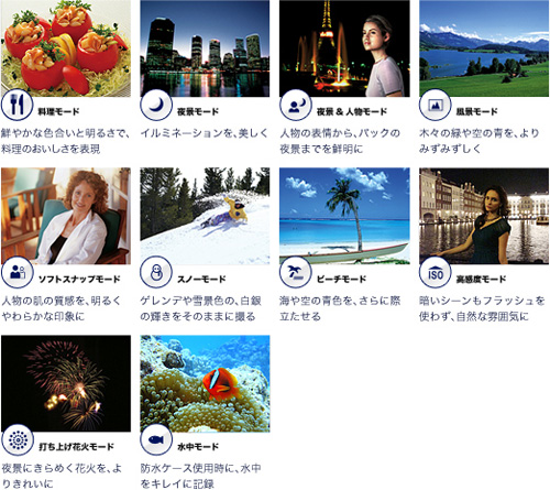 撮影シーンに応じたモードを選ぶだけで、カメラが適切なバランスに設定を調整する「シーンセレクション」を搭載。料理モードを選べば、グルメ雑誌のような明るくおいしそうな写真が手軽に撮影できます。水中モードではIS0感度の設定もでき、暗い海中でもブレを防いで明るく撮影。さらに、水中での動画撮影でも水中モードが使用できます。