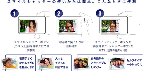 「おまかせオート撮影モード」時にも、「スマイルシャッター」を使用できます。これにより、「スマイルシャッター」中も、「おまかせシーン認識」が働くので、夜景や逆光などの難しいシーンでも笑顔を美しく撮影できます。