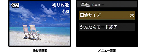 「かんたん撮影モード」を選べば、設定するのは「画像サイズ」と「フラッシュ」だけになり、よりわかりやすく操作できます。設定はシンプルでも、同時に「おまかせシーン認識」や顔検出機能「顔キメ」などがしっかりと働いているので、シーンに合った最適な設定でキレイに撮影できます。また、メニュー画面も、やさしい言葉で大きく表示されます。