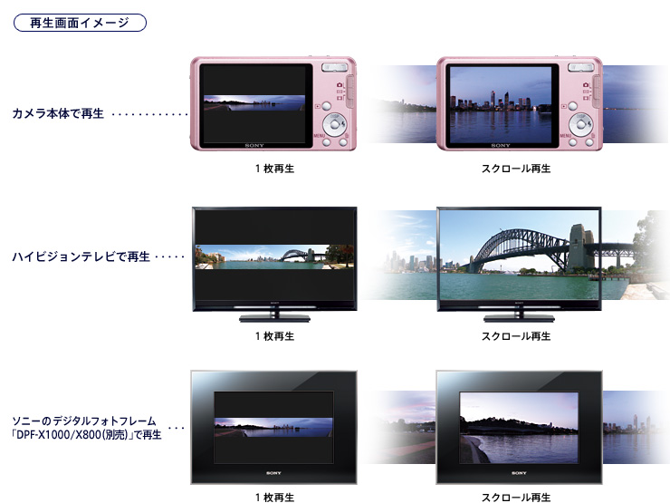 撮影したパノラマ写真は、カメラ本体はもちろん、別売のハイビジョンテレビやソニーのデジタルフォトフレームでも再生できます。これらのデジタル機器では、写真全体を表示する「1枚再生」に加え、独自の「スクロール再生」も可能。パノラマ写真の端から端までを、視線を動かすようにスクロール再生されるので、まるでその場にいるような臨場感あふれる写真鑑賞を楽しめます。また、PlayStation(R)3を使えば、好きなBGMをつけたスライドショーがつくれ、映像作品のようにパノラマ写真を楽しめます。
