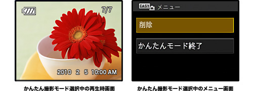 「かんたん撮影モード」を選択したまま、写真を再生すると、再生時の設定項目もやさしい言葉で大きく表示されます。これにより、再生時もわかりやすく操作できます。