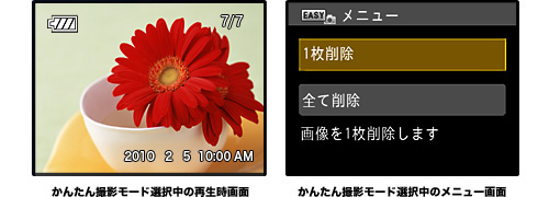 「かんたん撮影モード」を選択したまま、写真を再生すると、再生時の設定項目もやさしい言葉で大きく表示されます。これにより、再生時もわかりやすく操作できます。