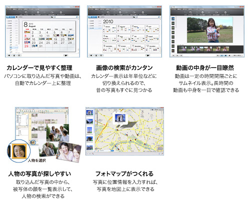 画像管理ソフト「PMB(Picture Motion Browser」を付属。撮影した写真や動画を整理したり、楽しく活用したりすることができます。
