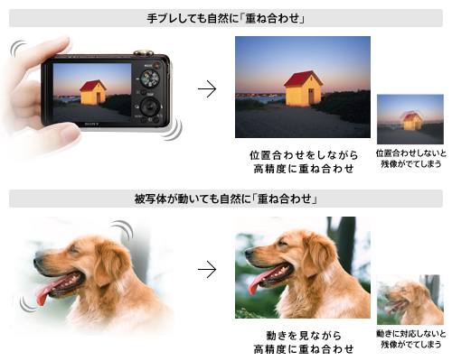 ソニー独自の「重ね合わせ処理」技術により、連写時に手ブレしても、被写体が動いても、自然な重ね合わせが可能です。