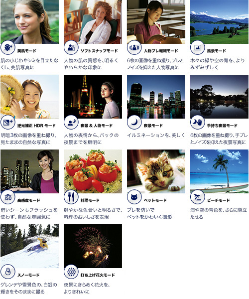 撮影シーンに応じたモードを選ぶだけで、カメラが適切なバランスに設定を調整する「シーンセレクション」。「風景」「料理」「ペット」など14モードを用意し、さまざまなシーンでキレイな写真を残せます。
