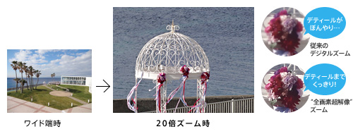 光学10倍ズーム搭載。さらに、新開発のジャイロセンサーにより高倍率ズームで起こりやすい手ブレを高精度に補正するとともに、高速のオートフォーカスで撮りたい瞬間をブレずに逃さず撮影できます。また、“全画素超解像”ズームなら、20倍相当(*)の高倍率ズームで高画質な撮影ができます。
