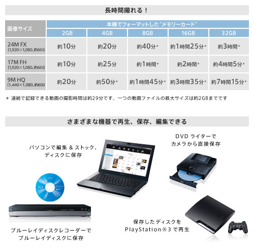 サイバーショットのフルハイビジョン動画は“ハンディカム”と同じAVCHD方式を採用。高圧縮率だから高画質の映像を長時間記録でき、さまざまな機器で再生、保存、編集できます。