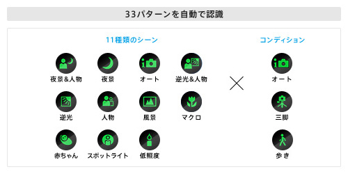 シーンに合わせて設定を自動調整してくれる「おまかせシーン認識」は動画撮影にも対応。合計33パターンの組み合わせから、撮影シーンに合わせて設定を細かく自動調整。逆光やスポットライトなど難しいシーンでも美しい映像を残せます。