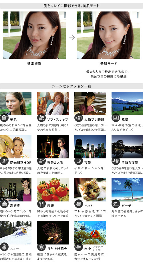 撮影シーンに応じたモードを選ぶだけで、カメラが適切なバランスに設定を調整する「シーンセレクション」。顔の小じわやシミ、くすみなどを目立たなくし、目や口もとにメリハリをつけて肌をキレイに撮影できる「美肌」を始め、「風景」「料理」「ペット」など15モードを用意し、さまざまなシーンでキレイな写真を残せます。
