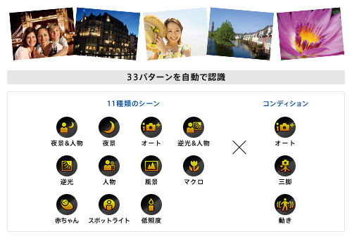 11種類のシーン認識に加え、被写体や撮影者の状況(コンディション)も認識。合計33パターンの組み合わせから、シーンに合った最適な設定にきめ細かく自動調整します。