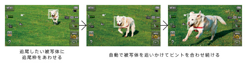 撮りたい被写体にタッチすると、被写体に追尾枠がセットされ、フォーカシングがスタート。被写体が動いても追尾枠が追いかけ、ピントを合わせ続けるので、構図づくりなどに集中できます。