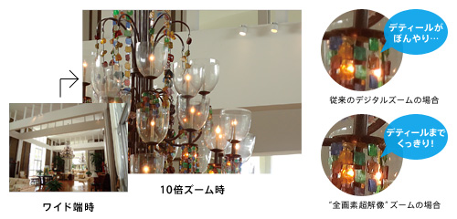ソニー独自開発の“全画素超解像”技術を採用したズームを搭載。この“全画素超解像”ズームを使えば、一般的なデジタルズームのような画質劣化もなく、解像感を保ったまま約10倍(*)まで拡大できます。さらに、最大画素設定(16M)の状態なら、デジタルズームを併用すれば、約20倍(*)までのズーム撮影も可能です。