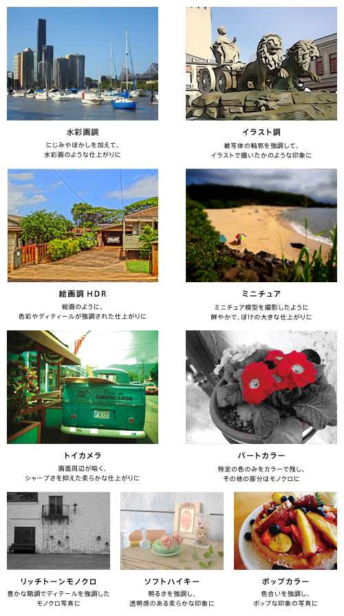 いつもの風景やポートレートの印象を変えて撮影できる「ピクチャーエフェクト」が進化。「水彩画調」「イラスト調」の2モードが加わり、合計9つのモードから多彩な演出を選べます。また、「水彩画調」「イラスト調」の2モードは撮影後の写真にも対応し、後から加工できます。