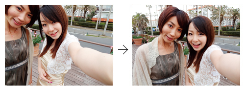 自分の顔にレンズを向けると、カメラが顔を検出して自動撮影。顔検出機能により、カメラが最適な構図を決めるので、フレームから外れることなく“自分撮り”が行えます。また、「自分撮り2人」に設定すれば、友人や家族といっしょに楽しめます。