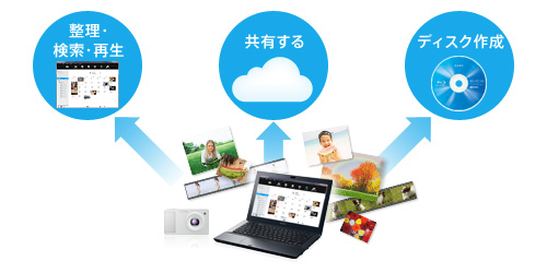 カレンダー表示で撮った映像をかんたんに整理・検索・再生が行えます。サイバーショットとパソコンをつなぐだけで、カメラ内の映像を取りこまなくても見ることができます。パソコンに取りこんでDVDを作成したり、その他の便利な機能を使ったり、楽しくかんたんに管理、活用できます。