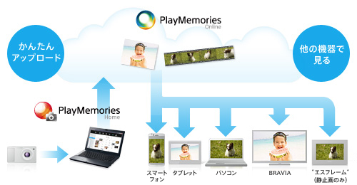 撮った映像をクラウドサービス“PlayMemories Online”にドラッグ&ドロップでアップロードでき、自分の写真や動画を〈ブラビア〉、タブレットなど多彩な機器で見られます。また、かんたん操作でFacebook、Youtube、mixiなどのネットワークサービスにアップロードできます。