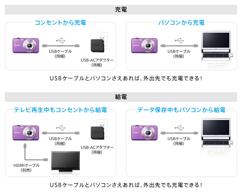 コンセントからも、パソコンからも充電できる。USB充電&給電機能