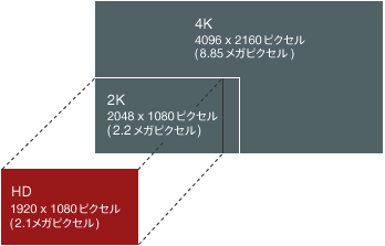 従来の映画制作・上映に使用されているフィルムでは、フィルムそのものが持つ非常に小さな粒子構造により、大画面で上映しても細部に至るまで美しい映像を表現することが可能でした。フィルムからデジタルに変わることにより、映像の構成要素は、フィルムの粒子からデジタルピクセルに変わります。より小さなピクセルサイズで一画面に含まれるピクセル数が多いほど、高精細で自然な映像を表現することが可能になります。高精細の“4K”映像は、スクリーン上のピクセルの大きさが“HD”、“2K”映像と比較して約1/4と非常に小さくなっています。
