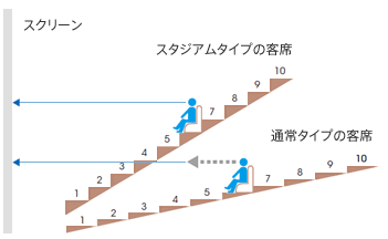 昨今、映画館の客席の配置は、よりスクリーンに近く傾斜のあるスタジアムタイプが増えてきております。臨場感を楽しむのに、スクリーンに近いこの配置は有効ですが、スクリーンに近づきすぎるとデジタル映像のピクセルが目立ってしまい、不自然な映像になってしまいます。このような時も“4K”映像はその小さなピクセルサイズにより、 “HD”“2K”映像と比較してピクセルに気づきにくく、映画館の客席の前方で観賞されるお客様に、とてもメリットがあります。