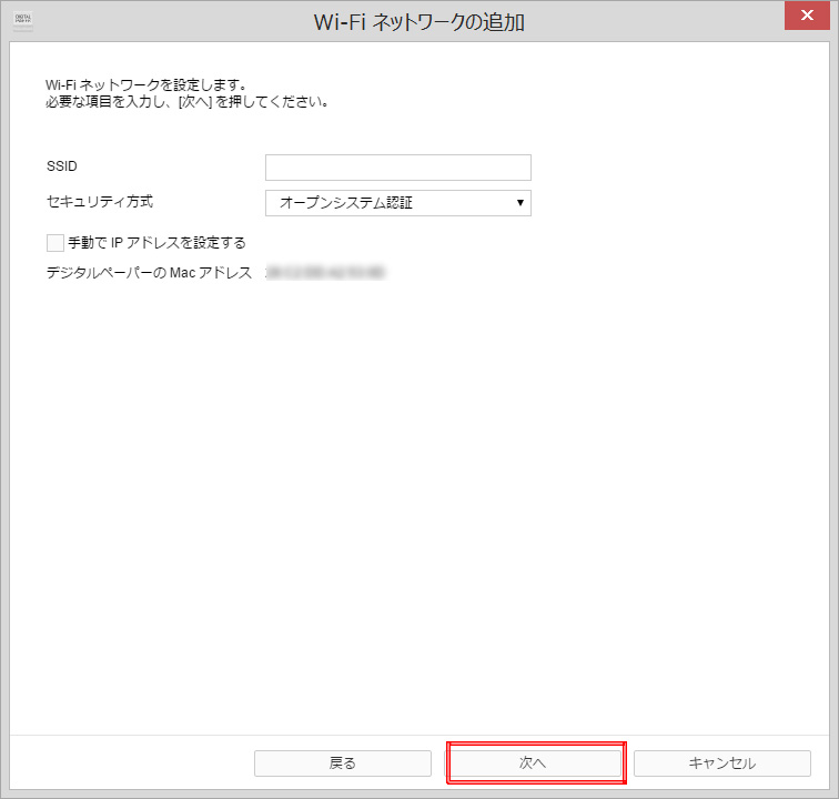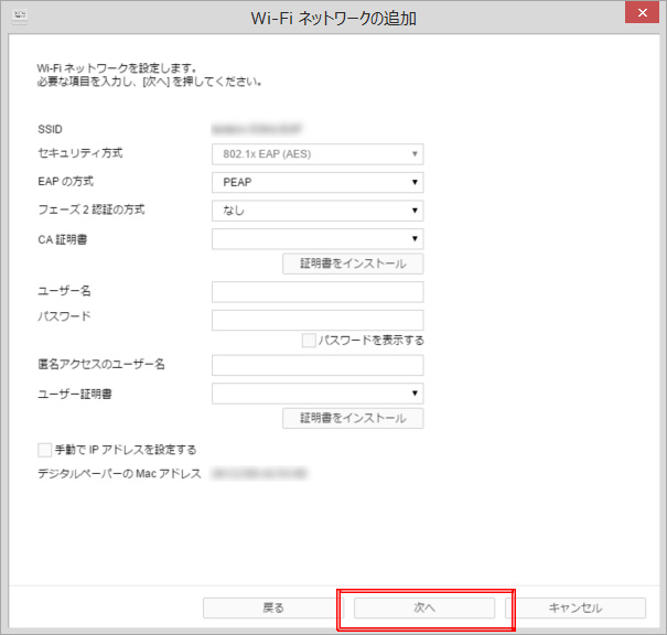 SSIDを入力し、必要な項目を入力した後、[次へ]をクリックします。