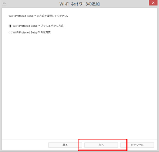 Wi-Fi Protected Setup™の方式を選択し、[次へ]をクリックした後、画面の指示に従って、無線LANルーターの操作を行ってください。