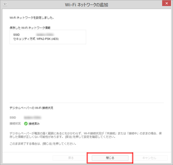 - 手順6 設定したWi-Fiネットワーク情報および、デジタルペーパーのWi-Fi接続状態を確認し、[閉じる]をクリックしてWi-Fiネットワークの追加設定を完了します。