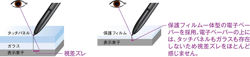 付属の専用スタイラスペンで文字などが書けます。パネル表面にガラスが無いため滑りにくく、より紙に近い書き味を実現しました。