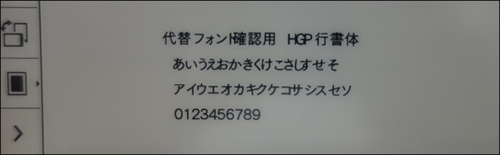 デジタルペーパーの「代替フォント」には行書体がない為、異なるデザインのフォントで表示されています。また文字間のスペースにバラつきやズレが生じています。