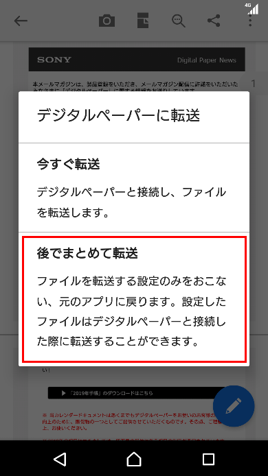 デジタルペーパーに転送したいドキュメントを Digital Paper App for mobile に設定しておき、デジタルペーパーと接続した際にまとめて転送できるようになりました。