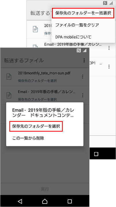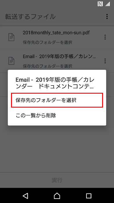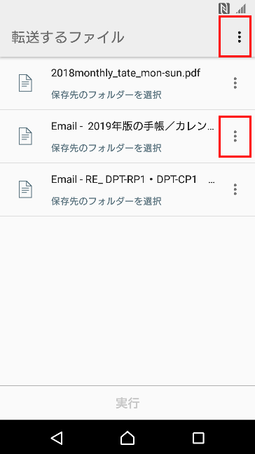 転送するファイルを選択。あるいは、設定したファイル全てを同じフォルダに転送する場合は右上のメニューをタップ