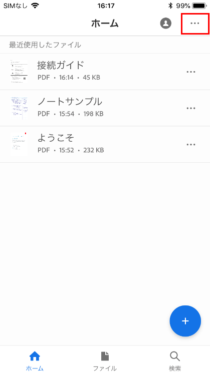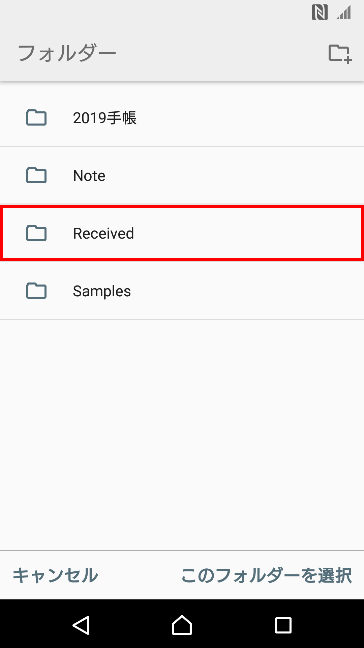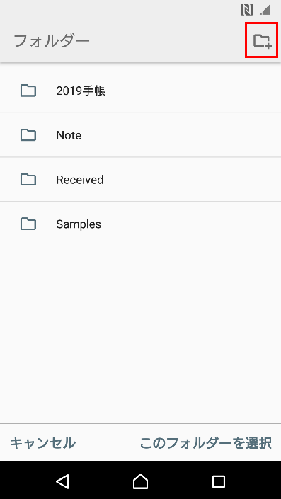 デジタルペーパーと接続すると表示される「フォルダー」画面で右上の「