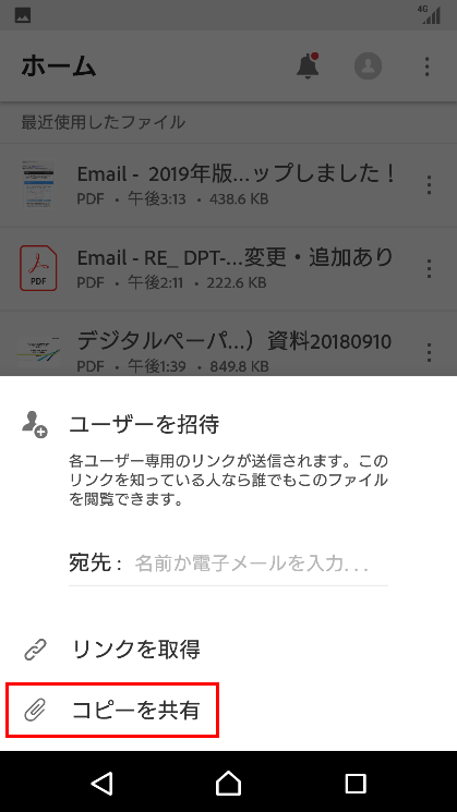 共有機能のメニュー名は、「共有」、「エクスポート」、「コピーを送信」、「コピーを共有」、「ファイルを送信」、「アプリで開く」など、アプリケーションによって異なります。