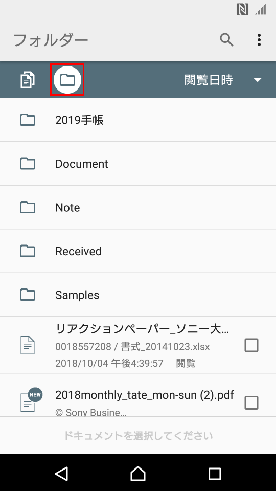 デジタルペーパーと接続すると表示される「フォルダー」画面で左上の「