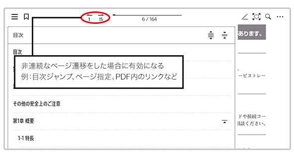 リンク先のページに遷移した場合や、目次による移動など連続していないページに遷移した場合に、遷移した履歴でジャンプする機能が加わりました。