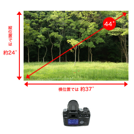 DT 18-70mm F3.5-5.6のズームレンズで焦点距離35mmの場合、画面の対角線上で約44度の範囲が写る。横位置では、約37度の範囲となる。 |