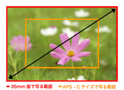 “α100”で採用しているCCDは、APS-Cサイズ 15.7mmt×23.5mmで、縦、横とも24mm×36mmサイズの35mm版フィルムサイズの約2/3のサイズとなり、写る範囲も約2/3になります。これは、35mm版フィルムサイズで撮影したものより、約1.5倍焦点距離の長いレンズで撮影した画角(写る範囲を画面の対角線で示したもの)とほぼ同じ、ということになります。ここでは、35mm版フィルムカメラを使われてきた方にわかりやすいよう、1.5倍と表記しています。 |