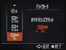 オートホワイトバランスで微妙な色合いを出したい場合には、プリセットホワイトバランスの設定では変化が大きいので、オートホワイトバランスを基準に、青みがかった画像と赤みがかった画像の計 3枚を1回シャッターを切るだけで画像を作成してくれる便利な機能です。 設定は、変化の大きい ホワイトバランスブラケットHiと変化の少ないLoがあります。