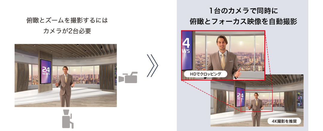 ・フォーカス領域は人物の動きに合わせてリアルタイムに自動で動くので、スムーズで滑らかなカメラワークの映像が実現します。 ・フォーカス映像の画質を粗くしないために、4Kカメラのご使用を推奨します。