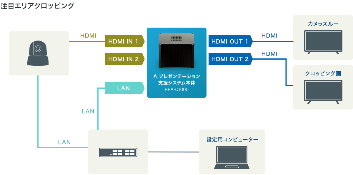 1台のカメラで全体俯瞰映像とフォーカスしたい領域映像の、2つの異なる画角の映像を同時に出力できるアプリケーションです。フォーカス領域として登壇者の表情を捉え続ける映像コンテンツは臨場感が伝わります。