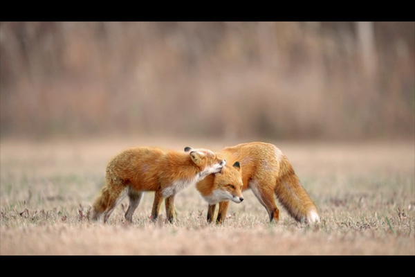 3匹の子ギツネが遊んでいるシーンは、MFで撮影しています。ピントの深さは、動物の動きを読み、顔の位置を予想して決めていますが、このときはキツネがどこを走るかわからなかったので、画面のどこにいてもピントが合うように、絞りを絞り込んでいます。