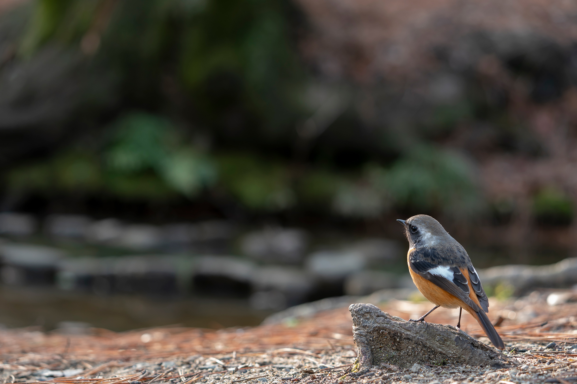 ただ、広角だと被写体が小さくなってしまうため、かなり近づく必要があるのですが、警戒心の強い野鳥には簡単には近づけません。最初はカメラの存在に慣れさせるために、遠くから400mmぐらいで撮りはじめ、カメラを落ち葉で隠したり、迷彩柄の専用レンズコートを巻いたりして撮影しています。鳥がカメラに慣れてきたらだんだん距離を詰め、最終的に広角レンズに換えてと…。何日も、場合によっては何カ月もかかります。このジョウビタキはひと冬かけて撮影しました。スズメくらいの大きさなので広めの画角ではかなり近づく必要があるので、あらかじめ鳥が止まる場所にカメラをセッティングし、太陽の位置や顔の向きを想定してフレーミングしています。自分は離れたところから双眼鏡をのぞきながら、鳥が来たらリモートコマンダーを使ってシャッターを切っています。