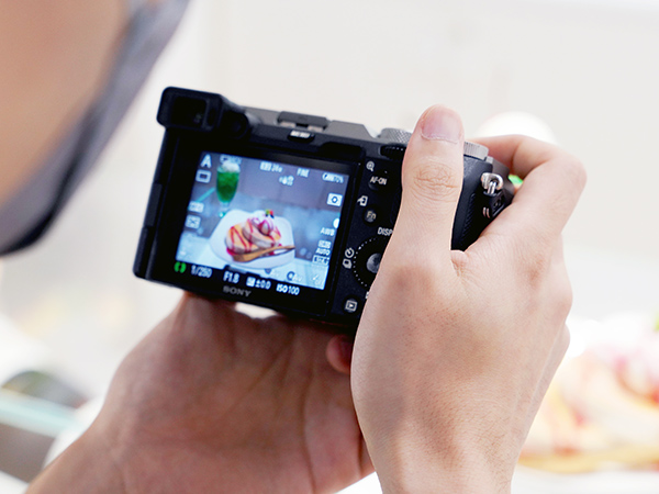 「モニターを自分側に向けると簡単に自撮りができますし、高層ビルやグラスのように縦長のものを撮影する時にも便利ですよ」(担当スタイリスト)