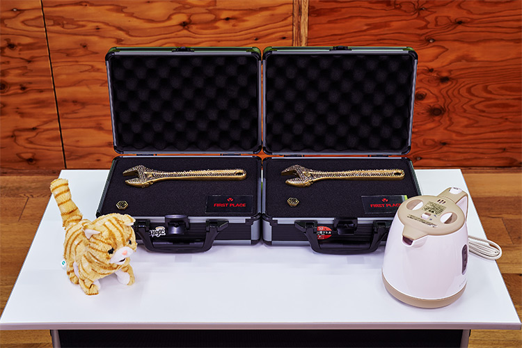 魔改造の原型となったネコのおもちゃとケトルと勝者に授与される金のスパナ。