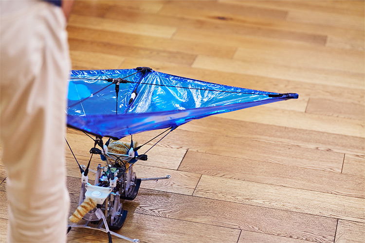 「パラシュートとは違い、最初から開いているのでしっかりとエアブレーキをかけることができます。さらに、安定した姿勢でしっかり足から着地するような形につくられています。これは、こうもり傘を逆さまに落としたときの動きから着想を得ました。これが走行時にも活躍してくれたのは意外でした」(土井)