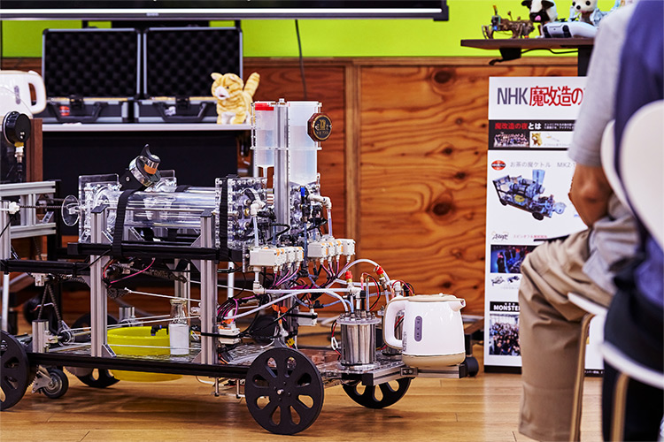 「電気ケトル綱引き」は、お湯が沸くときに生まれる蒸気の力を利用して綱引きで勝敗を決めるというものです。今回、会場で展示・実演されたものは「お茶の魔ケトルMKZ-1300N」の2号機「MKZ-130NW」です。『魔改造の夜』に登場した1号機に比べて、約1/6のサイズになりました。