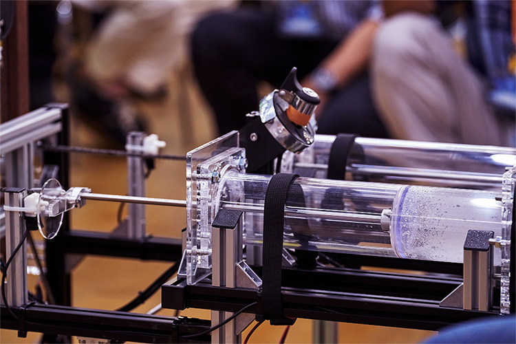 「蒸気の収縮力=大気圧を使って進む原理は同じですが、イベントに持ち出しやすいサイズにしました。また、1号機は据え置き型でしたが、2号機はタイヤに力が伝わり自走します。この機構を加えたことで、後ろの台車に子どもを乗せて走らせることができるようになり大人気になりました」と、チームリーダーの坂根 領斗は実演を始めました。